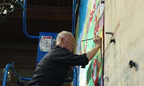 2012年秋,临近九旬的黄永玉搭乘升降机创作大幅作品《春江花月夜》。 通讯员 摄