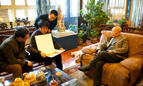 2012年3月,编委会成员在北京万荷堂与黄永玉交流《全集》事宜。 通讯员 摄