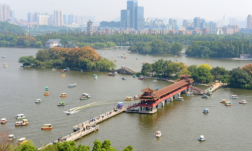 10月3日,众多游人在湖南烈士公园年嘉湖泛舟休闲。连日来,省会长沙天气晴好气温宜人,城区各大公园和景区也迎来国庆长假客流高峰。