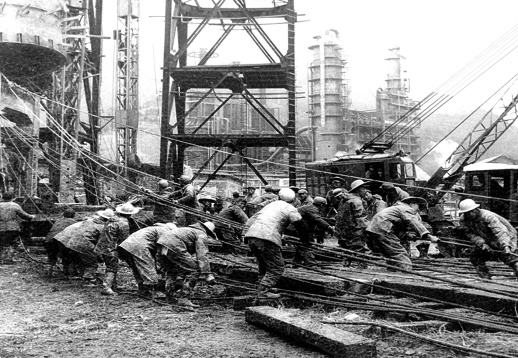 没有大型运输起重设施,长炼人用绳子拉、木块垫、撬杠撬,就这样把好几十吨重的设备、炼塔搬进现场,安装到位。