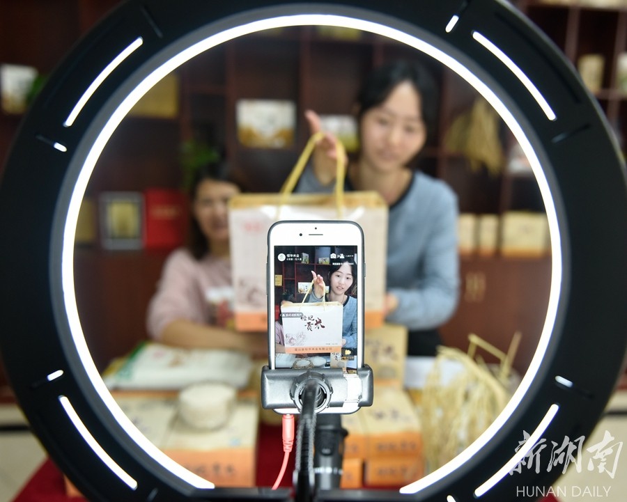 9月22日,蓝山县经开区归雁创业园恒华米业有限公司,工作人员在直播销售优质大米。时下,早稻和中稻粮食陆续上市,该县农业农村部门组织粮食加工企业开展粮食收购和深加工,通过线上直播、微信小程序等电商模式进行销售,拓展粮食销售渠道,促进农业增效、农民增收。 杨雄春 摄