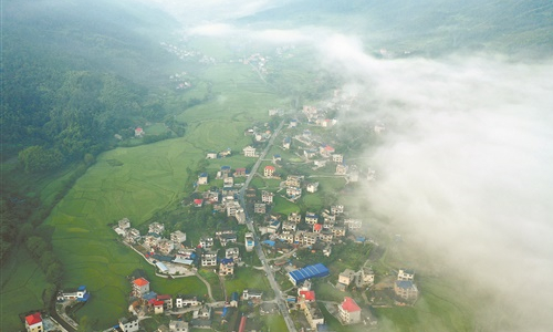 7月26日,晨色中的城步苗族自治县儒林镇庄稼村,田野绿意盎然,民居错落分布,薄雾萦绕,美如仙境。严钦龙 摄