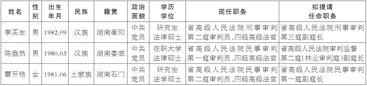 为进一步加强对省高级人民法院提请省人大常委会任命的人员的监督,增强其公信力和群众基础,现对拟提请省人大常委会任命法律职务的人员进行任前公示: