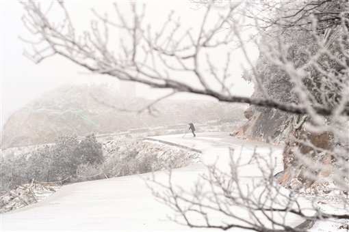 1月7日,双峰县井字镇紫云峰下,工作人员在山路上清除积雪。当天,该县部分山区迎来降雪,当地相关部门及时组织力量清理山路积雪,方便人们出行。李建新 摄