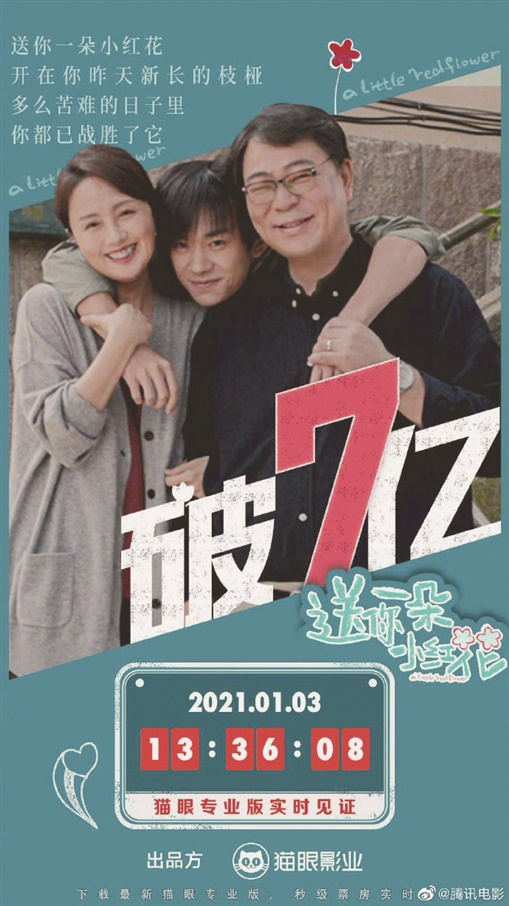 2020年最后一天,“跨年档”票房大爆发,《送你一朵小红花》《温暖的抱抱》《崖上的波妞》等新片上映,共斩获5.35亿票房。其中《送你一朵小红花》一骑绝尘,仅2020年12月31日一天的票房就达2.36亿,加上元旦,上映4天票房已破7亿,猫眼口碑高达9.3分。
