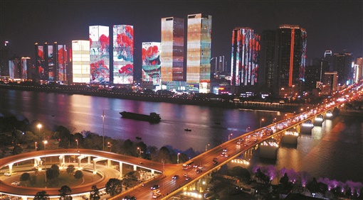 1月12日晚,湘江长沙城区段,临江楼宇外墙的LED光源呈现出一幅幅动态的主体图案。去年12月开始,长沙启动“一江两岸”城市照明提质工程,对长约20公里的湘江两岸,进行夜景照明提质升级。