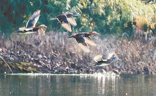 1月12日,麻阳苗族自治县石羊哨乡通达林村黄土溪水库,成群结队的鸳鸯振翅起舞。近年,该县加强生态环境保护,每年都吸引国家二级保护动物鸳鸯成群结队从北方来此过冬。 滕树明 摄
