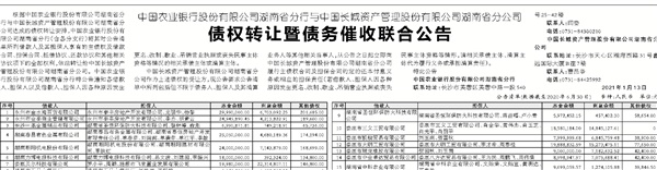 中国农业银行股份有限公司湖南省分行与中国长城资产管理股份有限公司湖南省分公司 债权转让暨债务催收联合公告