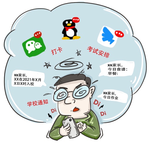 张同学在长沙市开福区一所中学读初三,她妈妈通过一个APP可以收到孩子进出校门、就餐情况、学校通知、考试安排等信息。虽然APP也有班级圈,但是从来没用过,和老师的交流基本上是在班级微信群和QQ群,老师布置作业也是在微信群。每天要看APP和几个群,还生怕有所遗漏,张同学的妈妈感到十分累。