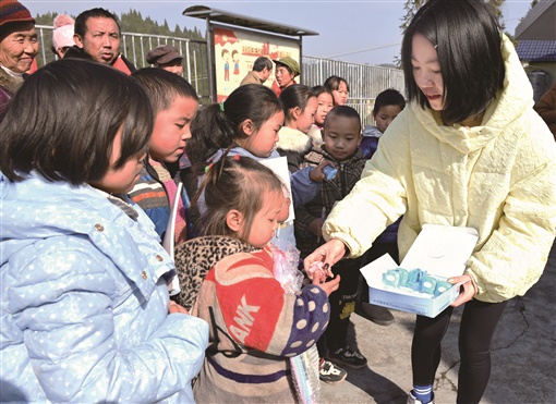 1月13日,吉首市丹青镇白云村小学,志愿者为留守儿童发放慰问品。当天,吉首市关工委、市民政局联合开展“寒冬送温暖 关爱留守儿童”慰问活动,为留守儿童捐赠冬衣冬帽等生活学习用品以及慰问金,送去关爱和温暖。
