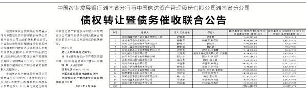 中国农业发展银行湖南省分行与中国信达资产管理股份有限公司湖南省分公司 债权转让暨债务催收联合公告