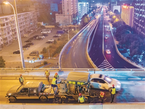 1月16日凌晨,长沙市东二环人民路至鸭子铺路段,长沙市桥隧养护运营有限公司工作人员在忙碌施工,将道路上原有的铁质中央隔离护栏替换成水泥护栏。该中央隔离护栏提质改造项目施工路段全长3918米,包括混凝土防撞墙的预制、安装和预留孔压浆、车道标线施划和限速标牌安装。湖南日报·新湖南客户端记者 唐俊 郑旋 摄影报道