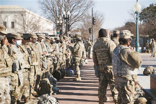 美国当选总统拜登就职典礼将于1月20日在首都华盛顿特区举行。连日来,华盛顿特区中心地带的安保措施日趋严密,国会大厦四周竖起高高围栏,围栏内外有众多国民警卫队队员持枪巡逻。
