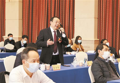 1月26日上午,彭钧委员(站立者)在九三、科协、科技、教育等界别的联组讨论时,为做好生态保护、修复洞庭湿地建言。湖南日报·新湖南客户端记者 赵持 摄
