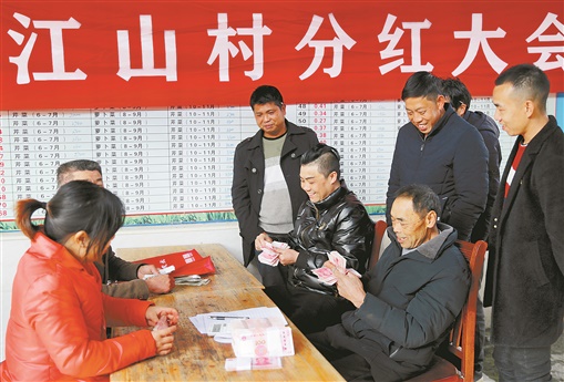 1月26日,村民高兴地领取分红钱。当天,桂东县沤江镇江山村2020年下半年股东分红大会举行,88户、336名村民共领到分红40余万元。近年,该村引进省级农业龙头企业,吸引村民分别以土地和劳动力入股,年底享受分红,实现抱团发展。邓仁湘 摄