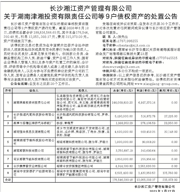 长沙湘江资产管理有限公司 关于湖南津湘投资有限责任公司等9户债权资产的处置公告