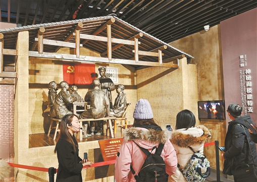位于韶山村村部的中共韶山特别支部历史陈列馆,复原了96年前火种点燃的时刻——“阁楼建支部”。一间阁楼上,4人围坐在桌前,青年毛泽东则站在桌子旁,向大家讲述着什么,墙上,还挂着一幅鲜艳的党旗。