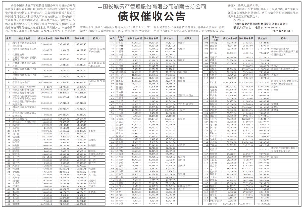 中国长城资产管理股份有限公司湖南省分公司 债权催收公告