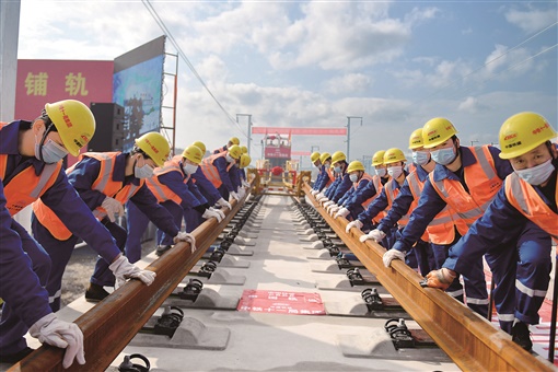 2月1日,在浙江临海,杭绍台铁路工程转入全线铺轨阶段。它连接浙江杭州、绍兴和台州三个设区市,是我国首条民营资本控股的高速铁路项目。