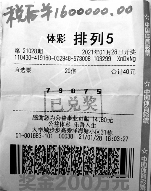 1月29日上午,湖南体彩服务大厅又迎来一位兑领排列5游戏大奖的中奖者。中奖者张先生(化名)以一张投注金额40元、倍投20倍的直选票命中排列5游戏第21028期200万元大奖。大奖出自长沙市大学城步步高旁洋海塘小区31栋4301001683体彩投注站。