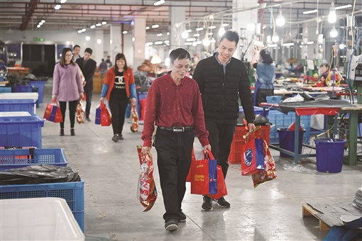 在福建省福州市闽侯县一家户外用品工厂,除了政府出台的补贴政策之外,企业还为留下来的90多名工人发放了年货大礼包。在工厂工作了十多年的工人张良国将领到的年货拍成照片,发给远在四川老家的儿子,告诉家人这里一切都好。图为2月1日,在福建省福州市闽侯县的亿格户外用品有限公司生产车间,四川籍计件工人张良国(前左)和工友提着年货准备下班。 本版图片均为新华社发 |