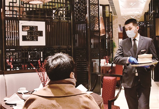 | ▲2月1日起,福建省内从事加工制作、传菜等接触直接入口食品工作的餐饮服务从业人员,按规定在工作时应当规范佩戴清洁的口罩。图为当日福州市台江区一家大酒店里,餐厅的端菜服务人员(右)佩戴口罩进行服务。 |