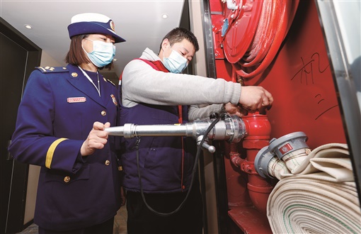 | 春节临近,宁夏银川市消防救援支队提前对大型商业综合体展开消防安全隐患排查检查。图为2月1日,消防监督检查人员在商务酒店内对消火栓压力进行测试。 |