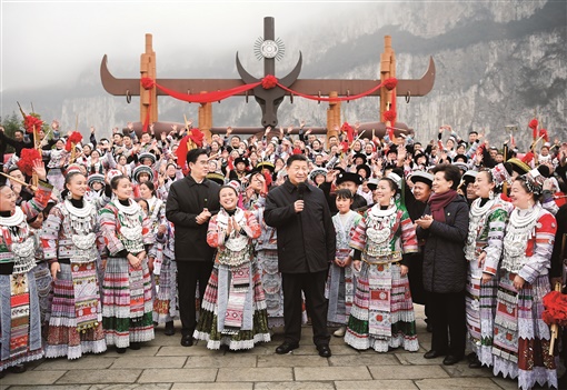 村文化广场上,乡亲们正在开展春节民俗活动,打起鼓、吹芦笙,载歌载舞,唱起了欢快的苗家迎客歌。看到总书记来了,大家齐声欢呼“总书记好”。习近平亲切地对乡亲们说,今年我们将迎来全面建成小康社会、实现第一个百年奋斗目标的伟大胜利。中华民族是个大家庭,五十六个民族五十六朵花。全面建成小康社会,一个民族不能落下;全面建设社会主义现代化,一个民族也不能落下。脱贫之后,要接续推进乡村振兴,加快推进农业农村现代化。希望乡亲们继续努力奋斗,把乡村产业发展得更好,把乡村建设得更美。临别时,乡亲们依依不舍簇拥着总书记,齐唱苗家留客歌,深情的歌声在乌江上空久久回荡。