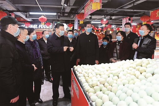 前来置办年货的群众热情向总书记问好。习近平亲切询问大家年货备齐没有。习近平强调,各级党委、政府和领导干部要把事关百姓切身利益的事情抓实抓好,尤其要落实防疫措施,加强食品安全监管,确保百姓过年安心、放心、舒心。