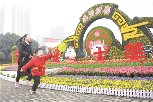 2月9日,长沙县星沙中心广场,小朋友在迎新春牛年主题花坛前玩耍。近日,该县城管局园林绿化维护中心在县内各公园、广场、主要道路进行摆花装饰,营造出花团锦簇、姹紫嫣红的春节气氛。