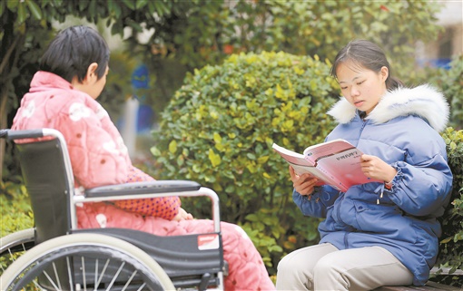2月7日,春日阳光洒在衡阳县曲兰镇船山村,照得人暖洋洋的。刚做完家务活的邹晴,走到母亲床前,托起母亲的头和腰,扶她坐起来,熟练地为母亲穿好衣服和鞋子后,再抱至轮椅上。