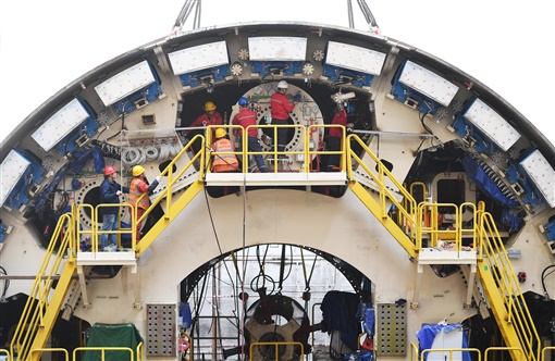 2月17日,中铁十四局长沙湘雅路过江通道项目河西段盾构始发井,施工人员将最后一块盾体分块吊装到位,标志着我省应用的最大直径盾构机盾体吊装完成。湖南日报·新湖南客户端记者 田超 通讯员 任如华 摄影报道