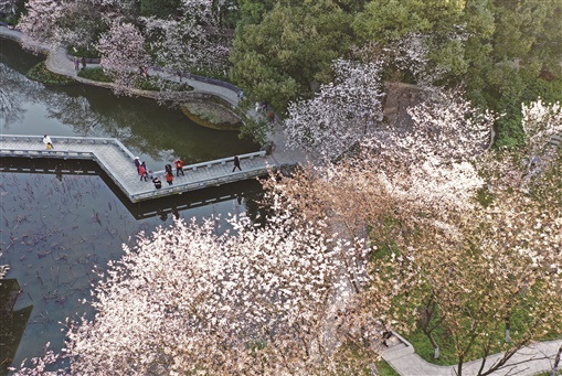 2月17日,长沙市望月公园,游客在铜盆湖畔观赏樱花。该公园的山樱树正值花季,一朵朵樱花迎风绽放,吸引了不少游客。湖南日报·新湖南客户端记者 田超 摄
