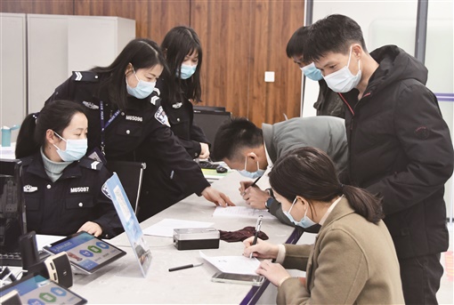2月17日,江永县政务中心,县公安局人口与出入境管理大队民警在为群众办理身份证。春节期间,该县户籍民警放弃休息,坚守岗位,为返乡人员办理人口异动手续、补办身份证等。田如瑞 摄 |