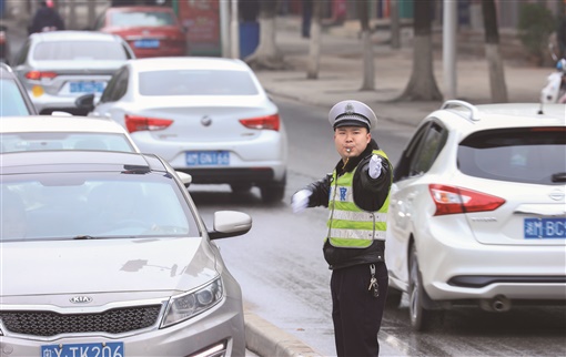 2月13日,东安县交警大队民警叶贤在县城重要路段指挥车辆通行。针对春节期间人流量、车流量增大的情况,该县交警坚守岗位,确保交通畅通。 严洁 摄 |