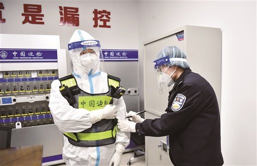 2月13日,长沙黄花国际机场,湖南出入境边防检查总站长沙边检站,勤务辅警刘娇娇(右)在给哥哥——执勤四队民警刘化志穿戴防护服,准备登机检查。 湖南日报·新湖南客户端记者 童迪 摄 |