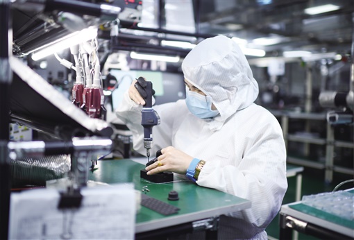 在可孚医疗生产车间内,SMT生产线加速运转,口罩、体温计等防护物资在这里批量生产。