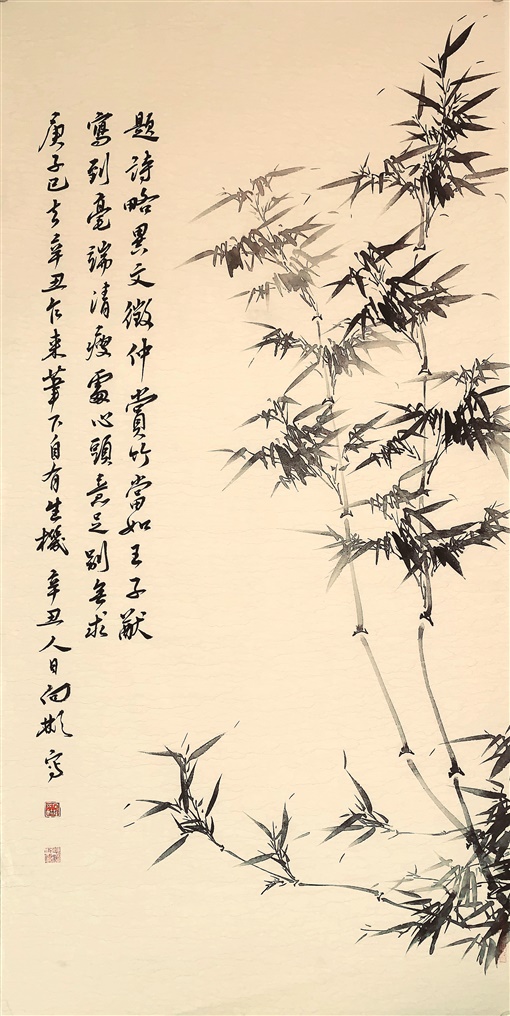 “淡淡晴光细细风,寥寥笔墨意融融。疏疏叶影生生气,浅浅深深落落中。”这题画诗是我这个“贺岁档”中书画生活的真实写照。50余幅画作上的题款都是我新作的诗词,以诗情与画意来表现人间的无限美好。庚子岁腊月廿七日是立春之日,腊月立春是比较少见的,我特意画了一件《红梅图》纪念这个特殊的日子,并自题七绝:“立春腊月不寻常,何况群芳夜未央。只有梅花如往岁,枝头已放蕊间香。”正月里,我创作的墨竹图中,题画诗更是内心的真切表达。“借得东风意欲何?毫端叶影舞婆娑。竹君只诺向郎愿,我比板桥痴更多。”郑板桥是清代著名书画家,其诸多竹石图可谓家喻户晓。对竹的痴迷,“我比板桥痴更多”虽然有点夸张,但确实是我痴心于竹的真情实感。我在正月期间创作的两件墨竹图上都题写了这样一首自作七绝诗:“题诗略异文徵仲,赏竹当如王子猷。写到毫端清瘦处,心头意足别无求。”文徵仲是明代书画大家文徵明,他诗词书画样样精绝,是吴门书派和吴门画派的领袖人物,他与沈周、唐寅和仇英被誉为画坛“明四家”,又与祝允明、唐寅和徐祯卿被称为“吴中四才子”。我研究文徵明二十多年,喜欢他诗词的清雅文秀之气,尤其是他的题画诗,别有情趣。而王子猷是王羲之的第五子王徽之,他对竹情有独钟,“不可一日无此君”就是他留下的赏竹故事。所以,好的题画诗不仅仅是画意的诗化和画面的书画融合,更是内心情感的升华,是人文精神在画面中的折射。