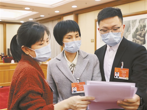3月7日,阳海玲、刘妍清、向伟艺(从左至右)三位代表在会后围绕政府工作报告交流讨论。