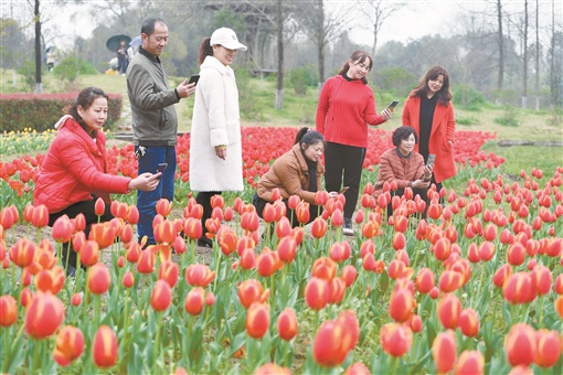 3月9日,长沙园林生态园,市民在参观郁金香花海。近日,该园5万株郁金香进入花期,绘就了一幅色彩斑斓的油画。本月20日至4月20日,园内将举办以郁金香、杜鹃花为主题的2021长沙春季花展暨第五届杜鹃花旅游文化节。