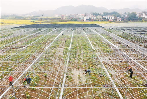 3月11日,武冈市法相岩街道独山村,工人在加紧建设全自动机械化育秧工厂。该育秧工厂为连栋全玻璃温室,总占地面积5万平方米,采用文洛式结构建造,以专用玻璃作为采光材料,配置有内外遮阳系统、电动开窗系统和水帘升降温系统等。建成后,可为当地种粮大户提供优质早稻秧苗2万亩。