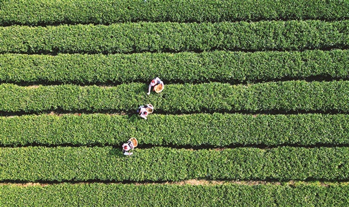 3月14日,常宁市塔山瑶族乡,茶农在采摘新茶。近年来,该市利用山区自然环境优势,将发展茶叶产业作为乡村振兴的“助推器”,带动当地农民致富。