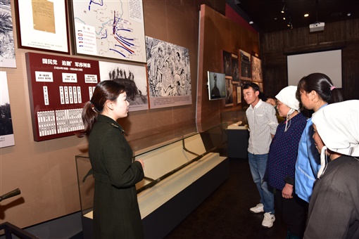 3月17日,通道转兵纪念馆展览大厅,伴随着《映山红》轻音乐,讲解员杨月颜向记者和当地群众讲解了一副红军担架的故事。