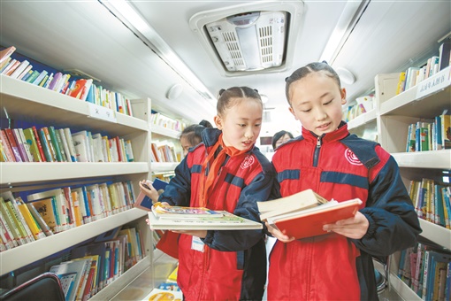 3月22日,长沙市望城区中岭小学,学生在流动图书车上看书、借书。当天,该校与长沙市图书馆举行流动图书车进校园活动,一辆满载课外读物的汽车驶入校园,让孩子们享受读书的美好时光。这辆流动图书车已开进30多所中小学,为3万多名师生办理了免押金读者证。