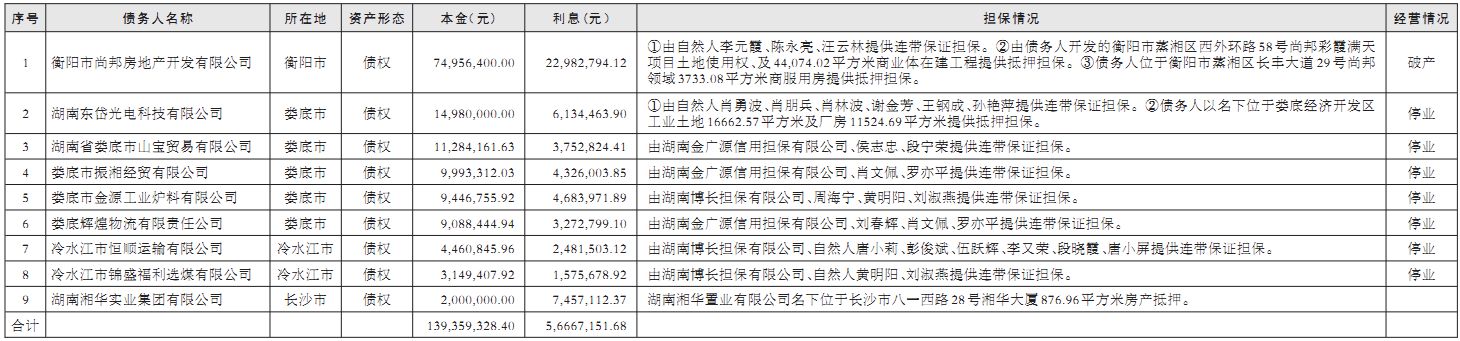 本资产包总金额为19,602.65万元,包含债权9户,涉及本金13,935.93万元,利息5,666.72万元,抵债资产0项,金额0万元(包内债权金额的截止日为2020年12月20日,抵债资产金额为抵债金额或抵债时的公允值),分布在湖南省衡阳市、娄底市、长沙市等三个地区。