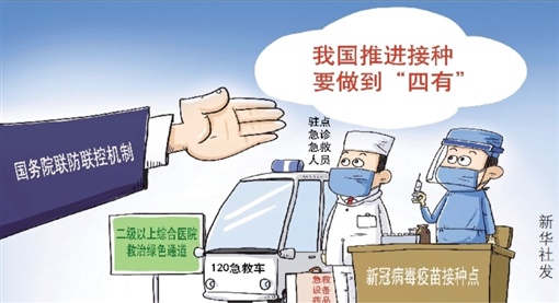 根据国务院联防联控机制的要求,我国推进接种要做到“四有”——有驻点急诊急救人员,有急救设备药品,有120急救车现场值守,有二级以上综合医院救治绿色通道。