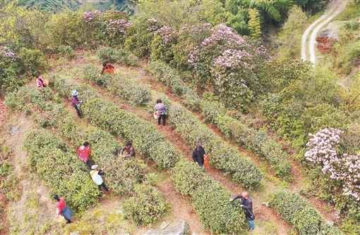 上图:3月26日,衡阳市南岳区寿岳乡“十里茶乡”茶场,茶农在采摘春茶。近日,该乡海拔800米的“十里茶乡”茶场的茶树新叶萌发,当地茶农抓住晴好天气,抢采明前云雾茶。曹正平 文兰 摄影报道
