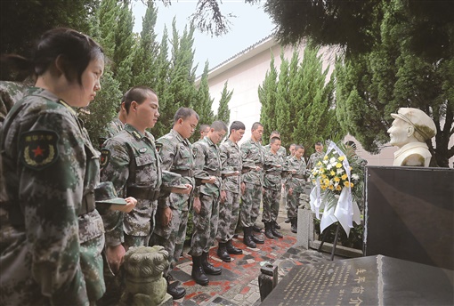 ▲4月2日,衡阳市烈士陵园,抗日民族英雄狼牙山五壮士之一的葛振林老英雄墓前,南华大学民兵预备役的同学们向革命先辈默哀。当天,该校开展“缅怀革命先烈,传承红色基因”清明祭扫活动,组织民兵预备役的同学们来到烈士陵园,向革命烈士敬献鲜花,聆听革命英雄故事、重温党的光辉历程,传承红色基因。