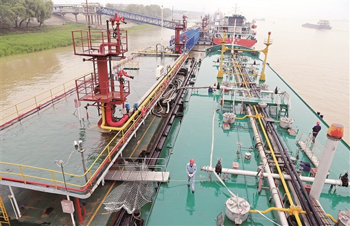 4月13日,巴陵石化储运部道仁矶储运装置化工码头2号趸船,一艘驳船在装载柴油,船员在巡检。近期,中石化巴陵石化公司开展百日安全无事故专项行动,切实优化物流储运,抓好安全清洁生产,确保公司物流“大动脉”畅通。彭展 摄