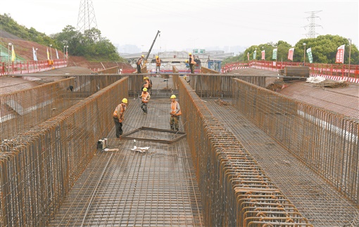 4月19日,长沙市红旗路(战备路—绕城高速)建设工程现场,施工人员在绑扎箱梁结构钢筋骨架。该工程按城市快速路设计,主线高架桥全长约3500米,采用双向六车道,标准桥宽25米,设计速度为60公里/小时。目前工程已完成全部桩基施工,下部结构及箱梁结构正加速推进,计划于2022年4月基本完工、具备通车条件。湖南日报·新湖南客户端记者 田超 摄